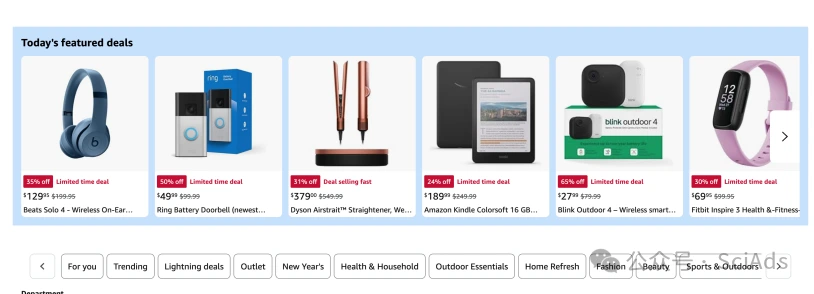 而广告是花钱给其它第三方提供的流量渠道实现的营销。更通俗的说,设计团队做的listing优化也属于营销,但不是广告投放。另外,广告投放也不限于传统称为广告的产品(如SP广告),deal也是一种广告。